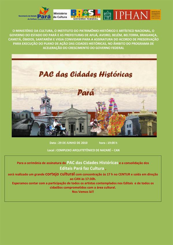 O Ministério da Cultura, Instituto do Patrimônio Histórico e Artístico (Iphan) e o Governo do Pará, juntamente com as prefeituras dos municípios de Afuá, Aveiro, Belém, Belterra, Bragança, Cametá, Óbidos, Santarém e Vigia, assinam nesta terça-feira (29) o acordo para a execução do Plano de Ação das Cidades Históricas (PACH), dentro das ações do Programa de Aceleração do Crescimento (PAC). O chamado PAC das Cidades Históricas vai investir cerca de R$ 600 milhões, entre cursos de todas as instâncias envolvidas, num grande plano de ação para recuperar monumentos, prédios e sítios históricos em todas as nove cidades citadas.