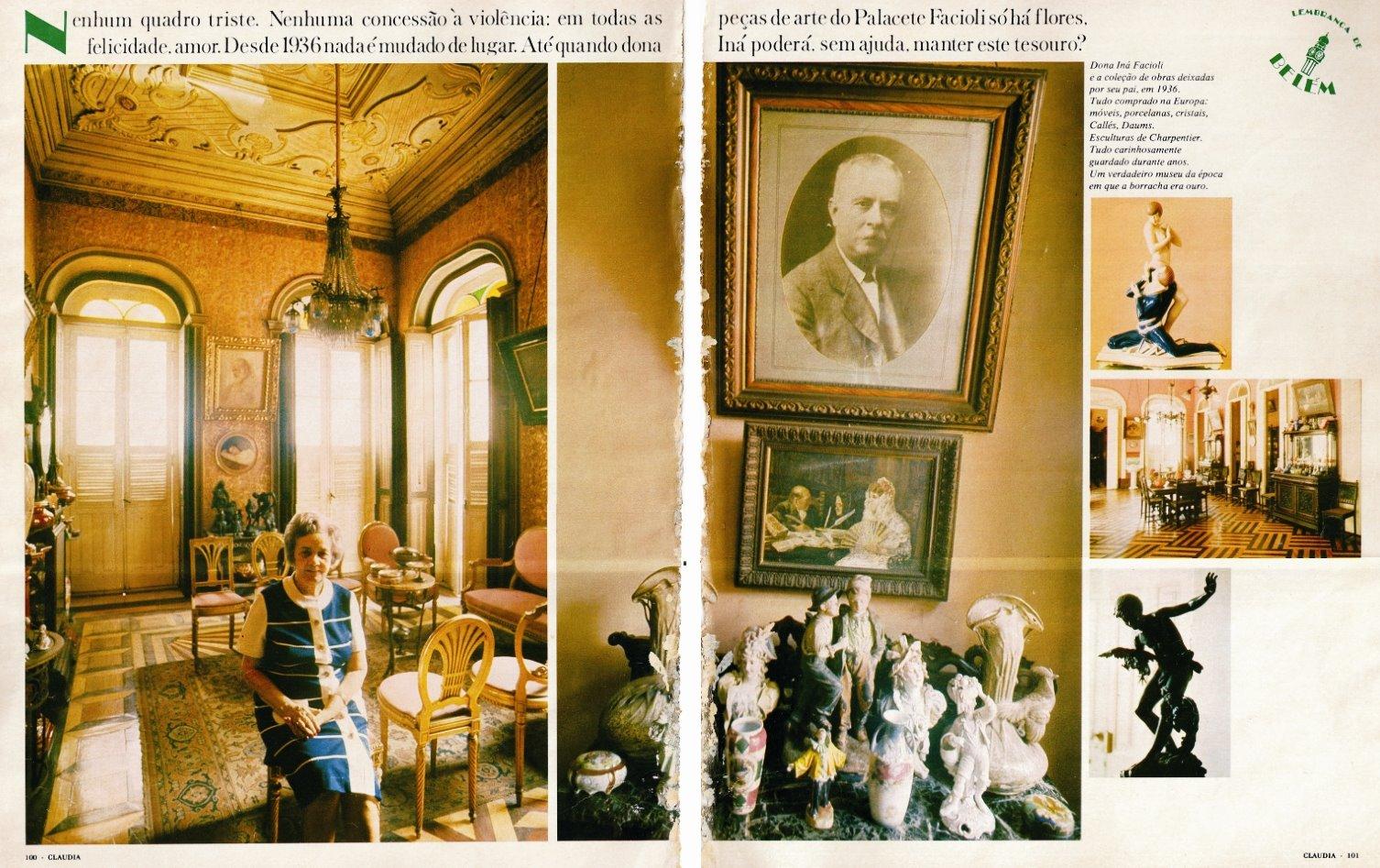 Prestes a levar um tombo, o palacete Faciola, ora em evidência suprema, é um exemplo cabal para ilustrar esta prosa: O cara que lá morava era provido abundantemente de dinheiro, cultura e poder. Levava uma vida de lorde e até confundido como um príncipe russo em Viena ele foi. Figura aristocrática como essa não há mais em Belém. Desde 1936 não se vê um Antônio Faciola com aqueles absurdos quatro anéis de brilhante no dedo anelar da mão direita sentado ao banco de trás do seu Rolls-Royce que sempre era conduzido por um garboso chauffeur com boné de aba transparente. O cidadão morreu e deixou sua herança aos filhos que a mantiveram até o limite de suas posses, precisamente até 1982 com o falecimento da Dona Inah. Temos aí um saldo positivo de 46 anos de cuidado absoluto com um patrimônio adquirido no tempo em que o dinheiro era capim. Esse balancete com incontestável superávit foi publicado na revista Cláudia do mês de maio de 1977: “Dona Inah Faciola (foto) e a coleção de obras deixadas por seu pai em 1936. Tudo comprado na Europa. Móveis, porcelanas, cristais, Gallés, Daums. Esculturas de Charpentier.