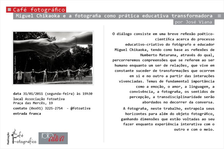 “Miguel Chikaoka e a fotografia como prática educativa transformadora” por José Viana – Café Literário da Fotoativa Publicado em 28 de janeiro de 201128 de janeiro de 2011 por ramiro quaresma Compartilhar no Facebook(abre em nova janela) Facebook Compartilhar no X(abre em nova janela) 18+ Compartilhar no Pinterest(abre em nova janela) Pinterest Compartilhar no WhatsApp(abre em nova janela) WhatsApp Enviar um link por e-mail para um amigo(abre em nova janela) E-mail Publicado por ramiro quaresma Ver todos os posts de ramiro quaresma