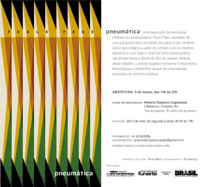 Contemplada pelo Prêmio Funarte de Arte Contemporânea 2010, da Fundação Nacional de Artes, “Pneumática” mostra o trabalho individual de Paulo Paes que constrói, pacientemente, gomo a gomo, suas esculturas. Para o presidente da Funarte, Antonio Grassi, ao conceder esse prêmio a artistas que valorizam a cultura popular, a Fundação Nacional de Artes estimula a multiplicidade de linguagens e tendências em suas mais variadas modalidades de manifestação, contribuindo para a difusão, o fomento e a reflexão das artes visuais.