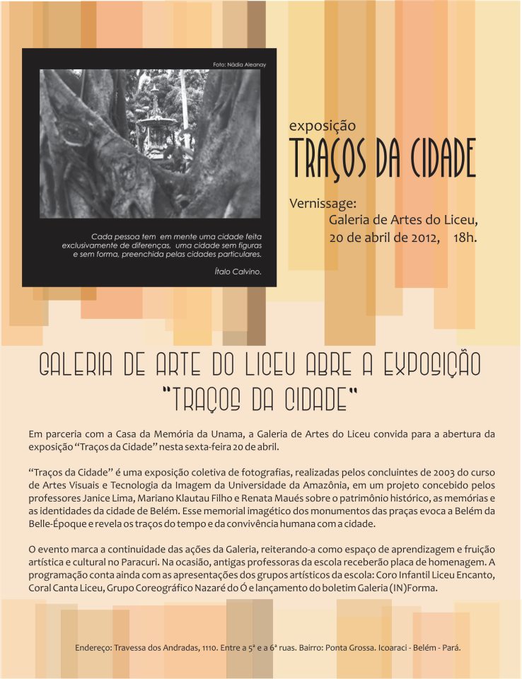 Exposição “Traços da Cidade” – Galeria de Artes do Liceu (Icoaracy) Publicado em 17 de abril de 2012 por ramiro quaresma Fonte: Jorge Martins Compartilhar no Facebook(abre em nova janela) Facebook Compartilhar no X(abre em nova janela) 18+ Compartilhar no Pinterest(abre em nova janela) Pinterest Compartilhar no WhatsApp(abre em nova janela) WhatsApp Enviar um link por e-mail para um amigo(abre em nova janela) E-mail Publicado por ramiro quaresma Ver todos os posts de ramiro quaresma