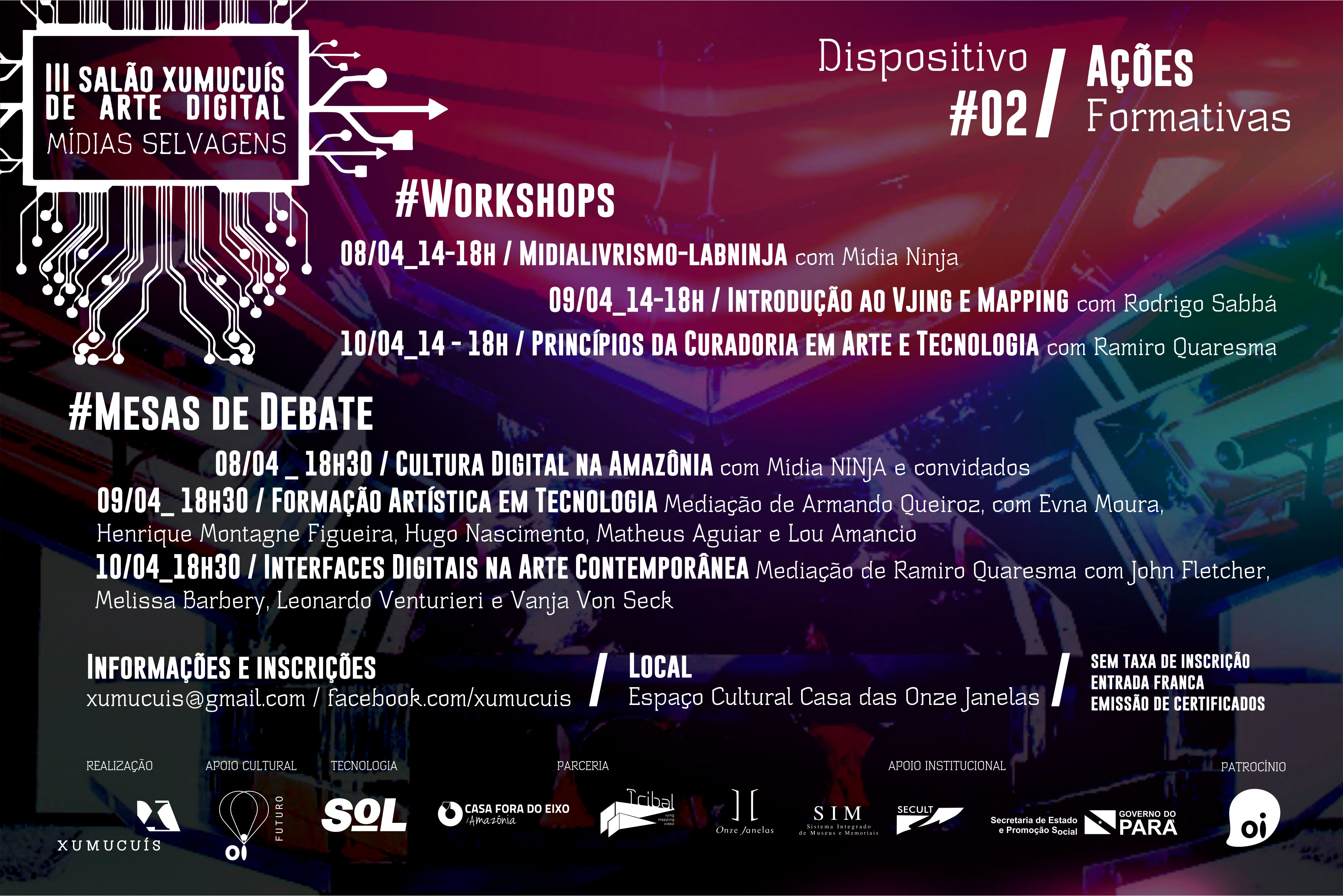 A abertura da terceira edição do Salão Xumucuís de Arte Digital, no dia 25 de Março no Espaço Cultural Casa das Onze Janelas foi o início das ações de exposição, intervenção, formação e discussão do projeto, que se consolida entre o circuito da arte contemporânea em interface digital no Pará e no Brasil. Nesta semana serão realizadas as intervenções propostas por artistas no espaço urbano de Belém e entre os dias 08 e 10 de Abril as oficinas e as mesas de debate com os artistas participantes.