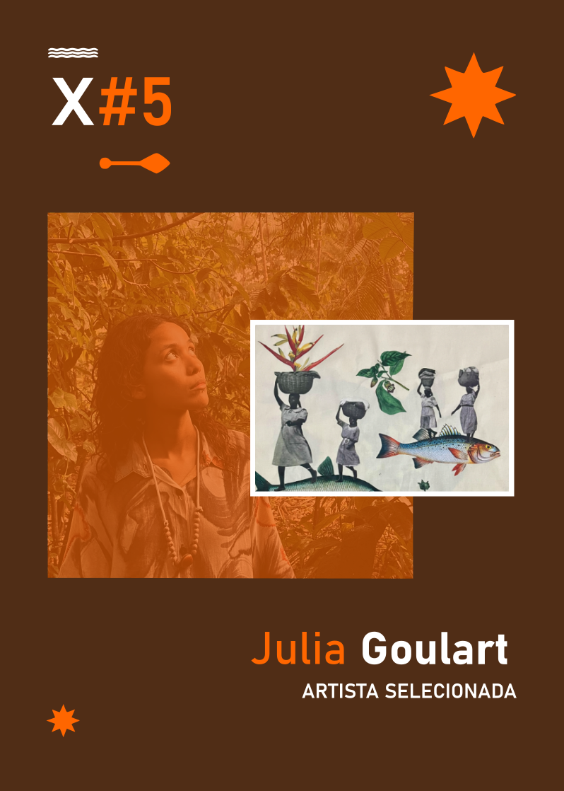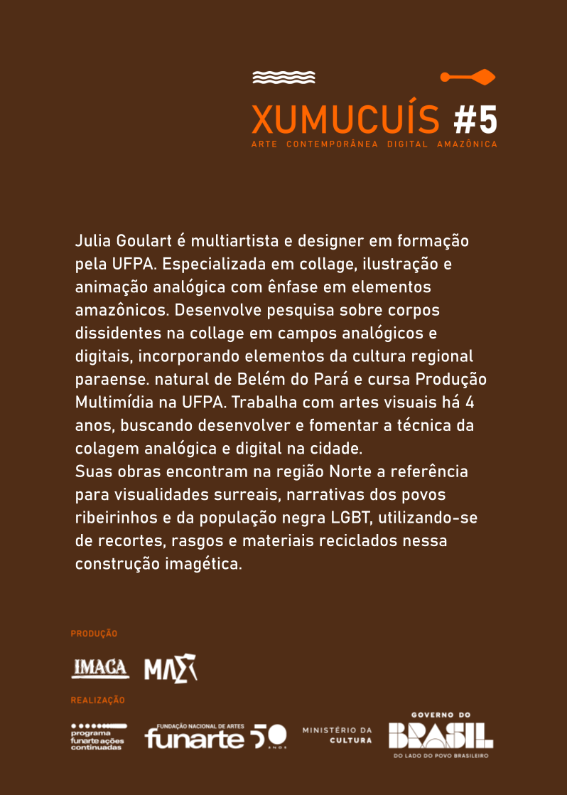 Julia Goulart é multiartista e designer em formação pela UFPA. Especializada em collage, ilustração e animação analógica com ênfase em elementos amazônicos. Desenvolve pesquisa sobre corpos dissidentes na collage em campos analógicos e digitais, incorporando elementos da cultura regional paraense. Suas obras encontram na região Norte a referência para visualidades surreais, narrativas dos povos ribeirinhos e da população negra LGBT, utilizando-se de recortes, rasgos e materiais reciclados nessa construção imagética.