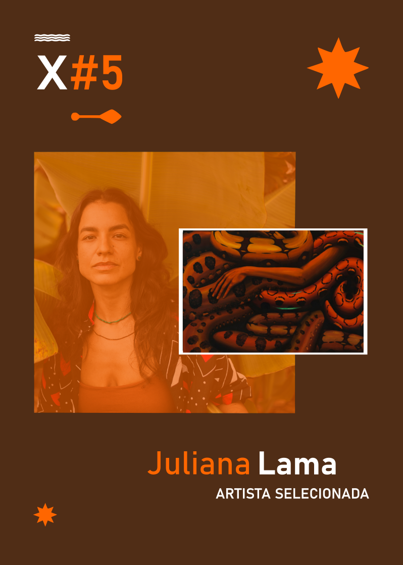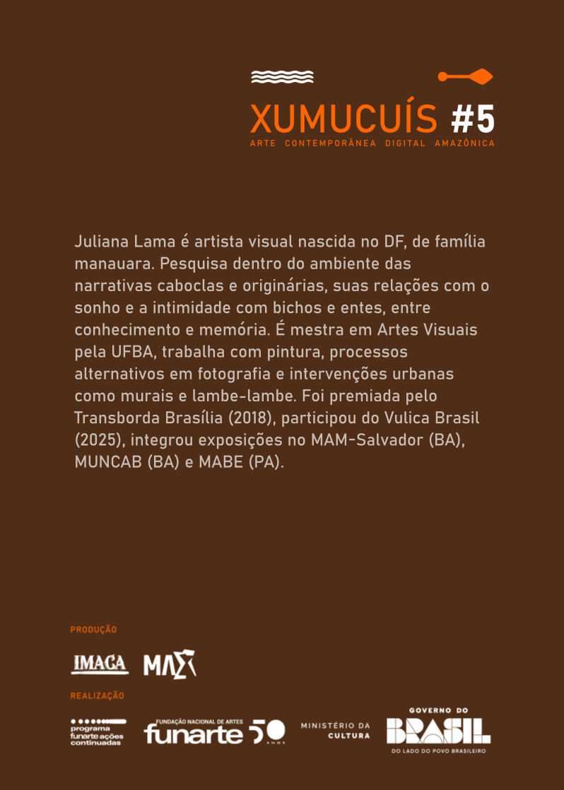 Juliana Lama é artista visual nascida no DF, de família manauara. Pesquisa dentro do ambiente das narrativas caboclas e originárias, suas relações com o sonho e a intimidade com bichos e entes, entre conhecimento e memória. É mestra em Artes Visuais pela UFBA, trabalha com pintura, processos alternativos em fotografia e intervenções urbanas como murais e lambe-lambe. Foi premiada pelo Transborda Brasília (2018), participou do Vulica Brasil (2025), integrou exposições no MAM-Salvador (BA), MUNCAB (BA) e MABE (PA).