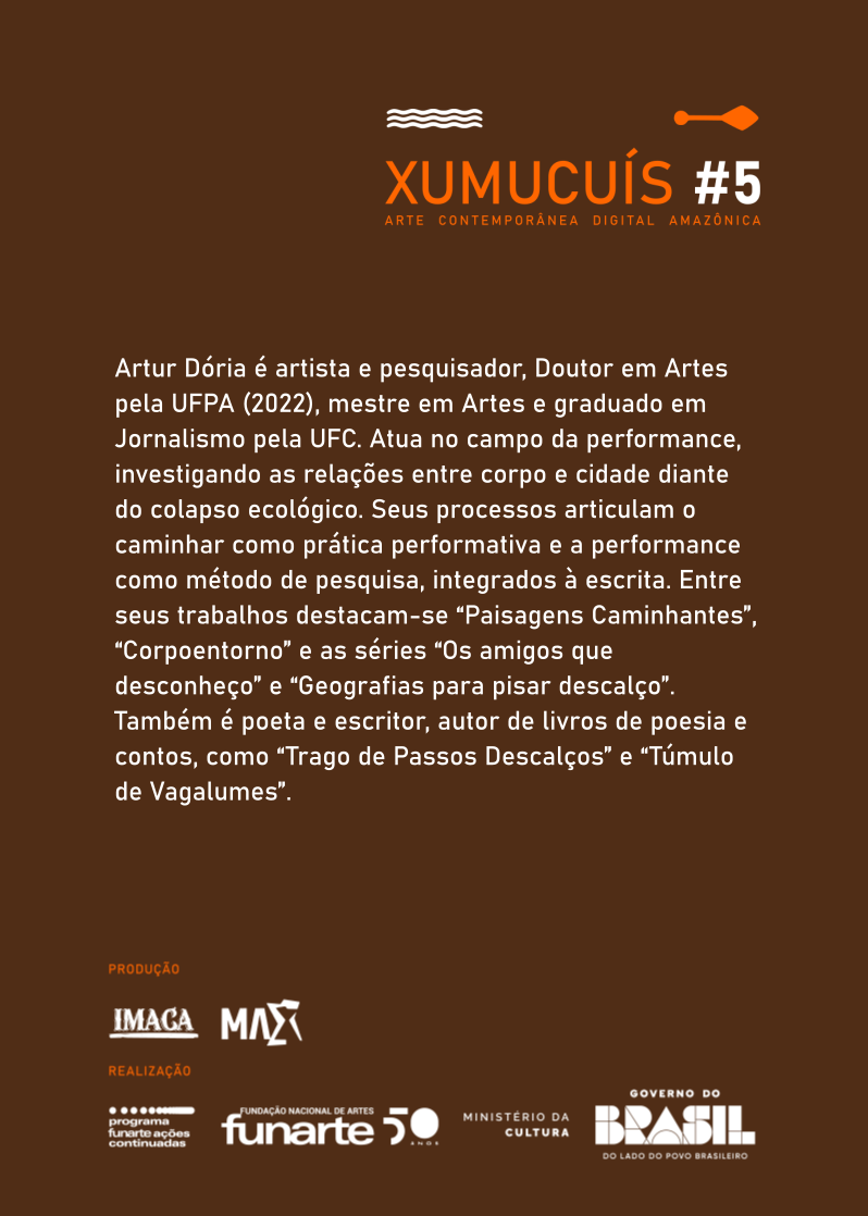 Artur Dória é artista e pesquisador, Doutor em Artes pela UFPA (2022), mestre em Artes e graduado em Jornalismo pela UFC. Atua no campo da performance, investigando as relações entre corpo e cidade diante do colapso ecológico. Seus processos articulam o caminhar como prática performativa e a performance como método de pesquisa, integrados à escrita. Entre seus trabalhos destacam-se “Paisagens Caminhantes”, “Corpoentorno” e as séries “Os amigos que desconheço” e “Geografias para pisar descalço”. Também é poeta e escritor, autor de livros de poesia e contos, como “Trago de Passos Descalços” e “Túmulo de Vagalumes”.