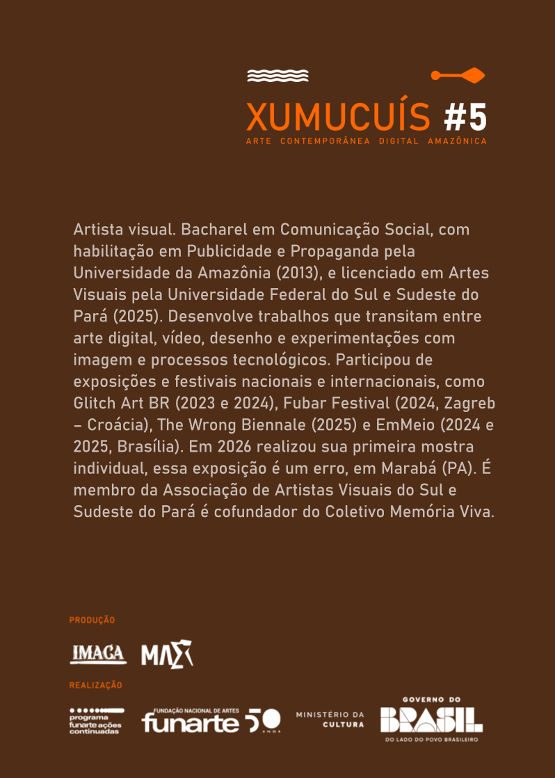 Lucas Wilm é Bacharel em Comunicação Social, com habilitação em Publicidade e Propaganda pela Universidade da Amazônia (2013), e licenciado em Artes Visuais pela Universidade Federal do Sul e Sudeste do Pará (2025). Desenvolve trabalhos que transitam entre arte digital, vídeo, desenho e experimentações com imagem e processos tecnológicos. Participou de exposições e festivais nacionais e internacionais, como Glitch Art BR (2023 e 2024), Fubar Festival (2024, Zagreb – Croácia), The Wrong Biennale (2025) e EmMeio (2024 e 2025, Brasília). Em 2026 realizou sua primeira mostra individual, essa exposição é um erro, em Marabá (PA). É membro da Associação de Artistas Visuais do Sul e Sudeste do Pará é cofundador do Coletivo Memória Viva.