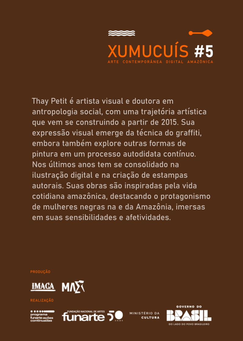 Thay Petit é artista visual e doutora em antropologia social, com uma trajetória artística que vem se construindo a partir de 2015. Sua expressão visual emerge da técnica do graffiti, embora também explore outras formas de pintura em um processo autodidata contínuo. Nos últimos anos tem se consolidado na ilustração digital e na criação de estampas autorais. Suas obras são inspiradas pela vida cotidiana amazônica, destacando o protagonismo de mulheres negras na e da Amazônia, imersas em suas sensibilidades e afetividades.