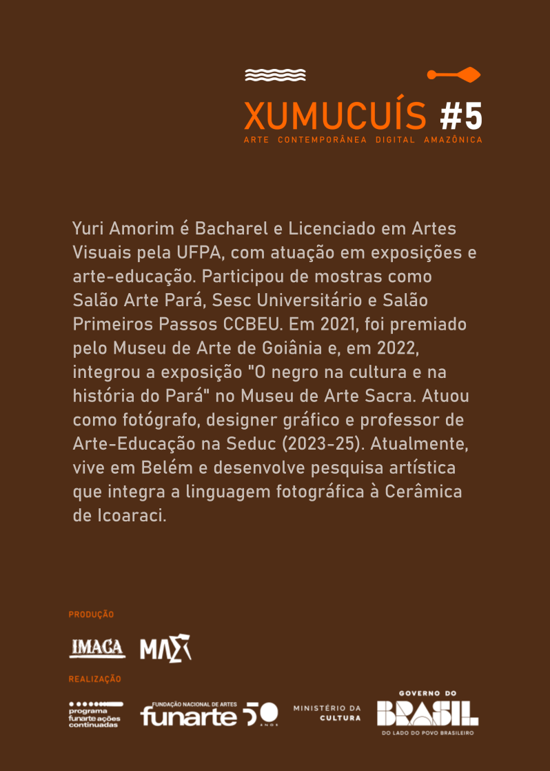 Yuri Amorim é Bacharel e Licenciado em Artes Visuais pela UFPA, com atuação em exposições e arte-educação. Participou de mostras como Salão Arte Pará, Sesc Universitário e Salão Primeiros Passos CCBEU. Em 2021, foi premiado pelo Museu de Arte de Goiânia e, em 2022, integrou a exposição “O negro na cultura e na história do Pará” no Museu de Arte Sacra. Atuou como fotógrafo, designer gráfico e professor de Arte-Educação na Seduc (2023-25). Atualmente, vive em Belém e desenvolve pesquisa artística que integra a linguagem fotográfica à Cerâmica de Icoaraci.