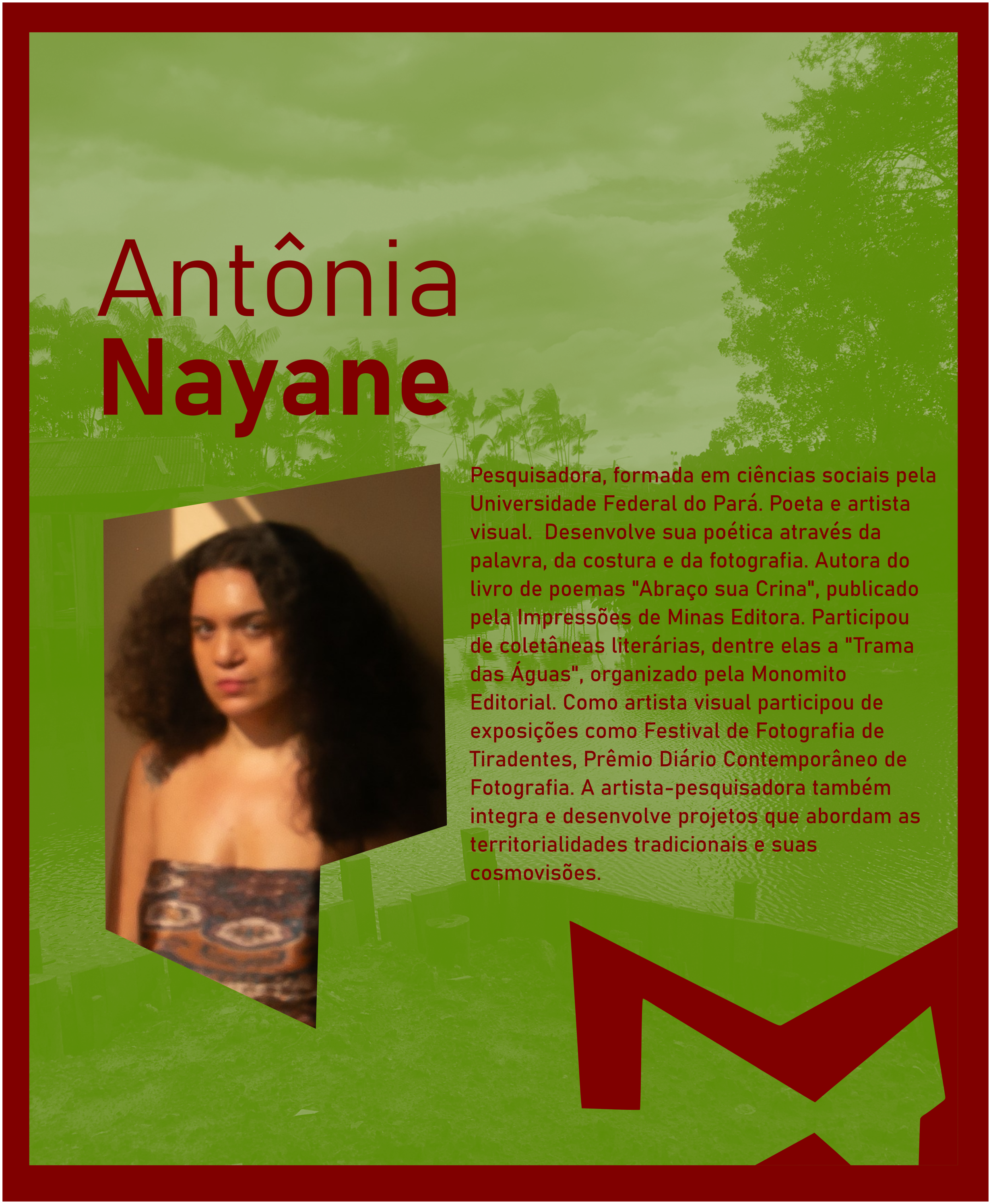Pesquisadora, formada em ciências sociais pela Universidade Federal do Pará. Poeta e artista visual. Desenvolve sua poética através da palavra, da costura e da fotografia. Autora do livro de poemas “Abraço sua Crina”, publicado pela Impressões de Minas Editora. Participou de coletâneas literárias, dentre elas a “Trama das Águas”, organizado pela Monomito Editorial. Como artista visual participou de exposições como Festival de Fotografia de Tiradentes, Prêmio Diário Contemporâneo de Fotografia. A artista-pesquisadora também integra e desenvolve projetos que abordam as territorialidades tradicionais e suas cosmovisões.