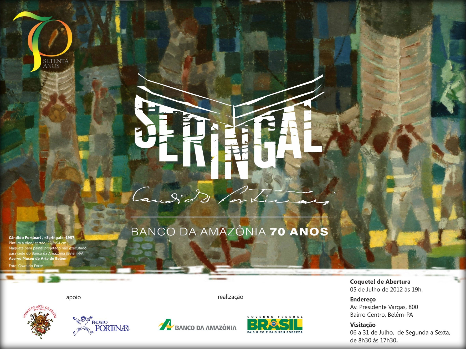 Em 1957, Candido Portinari criou um mural para a nova sede que seria construída para o Banco de Crédito da Borracha, atual Banco da Amazônia. A obra, que nunca saiu do papel, hoje pertence ao Museu de Arte de Belém na forma de um raro estudo em óleo sobre cartão. A mostra, com a parceria da Fundação Cultural de Belém e do Museu de Arte de Belém, que gentilmente emprestou a obra, também cumpre divulgar uma das mais significativas coleções de arte da cidade. O Banco da Amazônia, cumprindo seu papel de agente social e de desenvolvimento regional, tem a honra de trazer aos cidadãos da Amazônia o traço e as cores de nosso mais conhecido pintor. Com isso, prestam à toda a comunidade o acesso à cultura e à arte como um bem fundamental da vida e ao conhecimento da história, do passado e do presente.