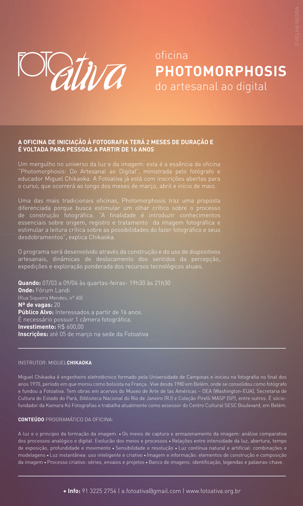 Um mergulho no universo da luz e da imagem: esta é a essência da oficina “Photomorphosis: Do Artesanal ao Digital”, ministrada pelo fotógrafo e educador Miguel Chikaoka. A Associação Fotoativa já está com inscrições abertas para o curso, que ocorrerá ao longo dos meses de março, abril e início de maio de 2012 em Belém.