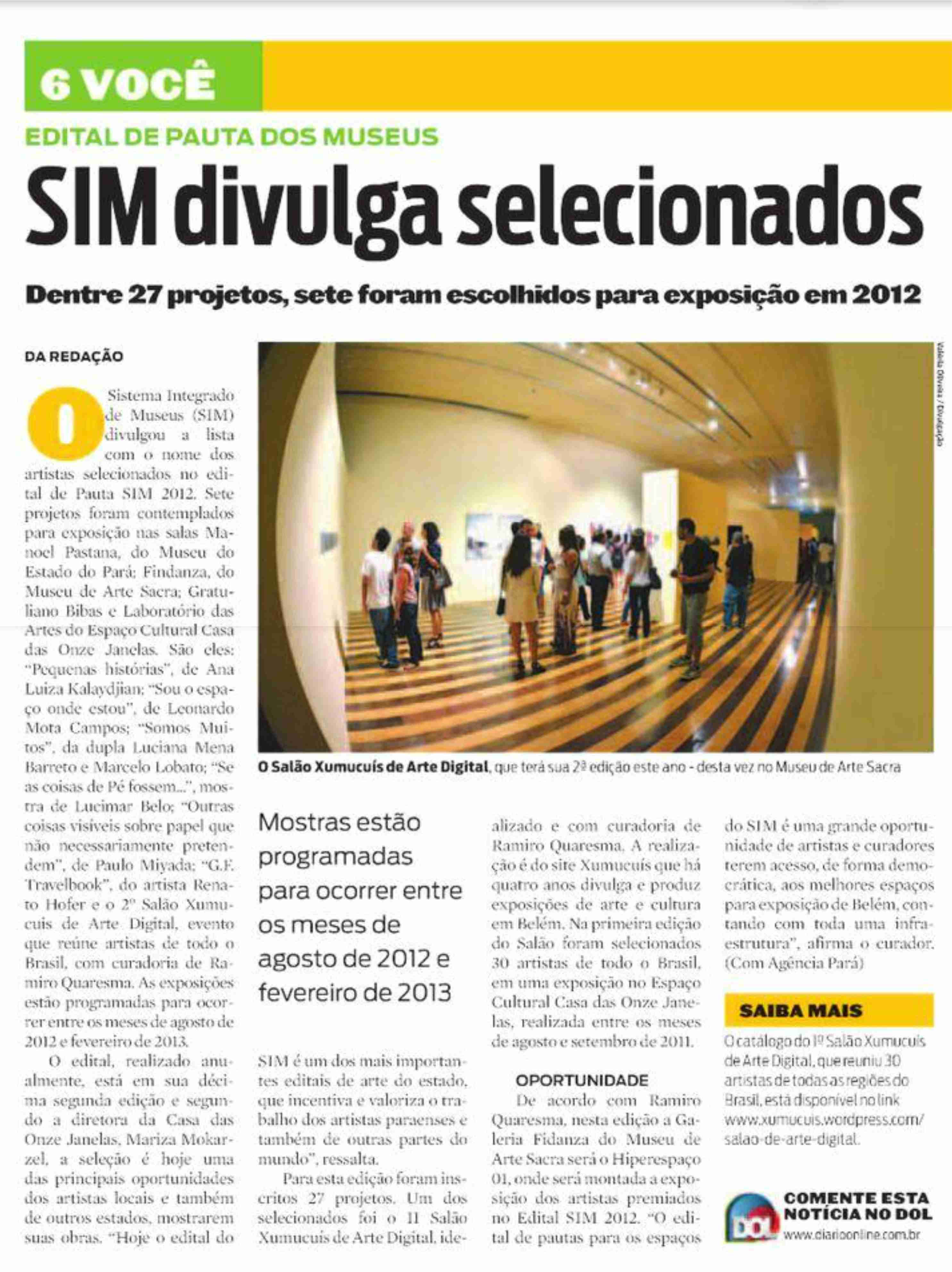 Resultado do Edital de Pauta SIM/2012 – A Comissão de Seleção do Edital de Pauta referente ao Espaço Cultural Casa das Onze Janelas, Museu de Arte Sacra e Museu do Estado  do Pará, formada por Emanuel Franco, Neder Charone e  Valzeli Sampaio selecionou os projetos dos seguintes artistas/curadores: Ana Luiza Kalaydjian; Leonardo Mota Campos –  AoLeo; Luciana Mena Barreto e Marcelo Lobato; Lucimar Belo;  Paulo Miyada; Ramiro Quaresma e Renato Hofer.