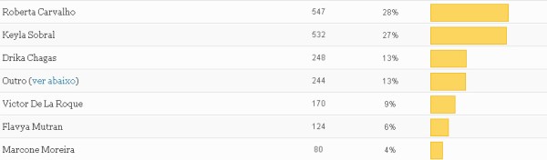 Mais de 1700 votos em nossa enquete que pergutou “Quem foi destaque nas artes visuais no Pará em 2011?” e os resultados são estes na tabela abaixo. Roberta Carvalho (28%) e Keyla Sobral (27%) foram as mais votadas, seguidas de Drika Chagas (13%), Victor de LaRoque (9%), Flavya Mutran (6%) e Marcone Moreira (4%). Agradeço a todos que votaram e comentaram, e principalmente aos artistas indicados que compreenderam a informalidade dessa enquete. O fotógrafo e curador Guy Veloso em sua análise do cenário das artes visuais para 2012 também citou os nomes de Roberta, Keyla, Flavya e Drika, em sintonia com nossa enquete.